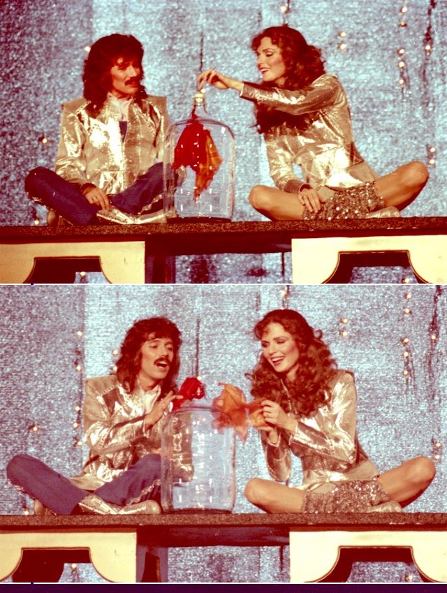 There’s a lot to love in this photo of Doug and Debbie performing the always fun “Dancing Handkerchief” routine. This was taken at St. Louis’s  Fox Theater circa 1985, and really shows the fun the two were having performing this famous illusion.
