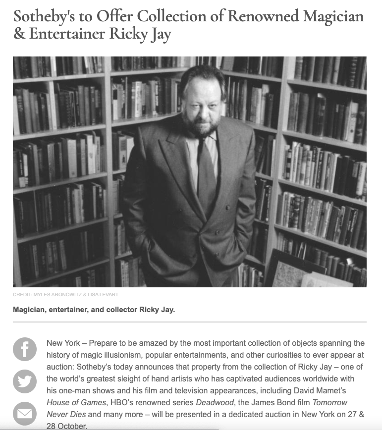 For all those collectors out there, Ricky Jay’s vast magic collection will be up for auction next month via Sotheby’s.