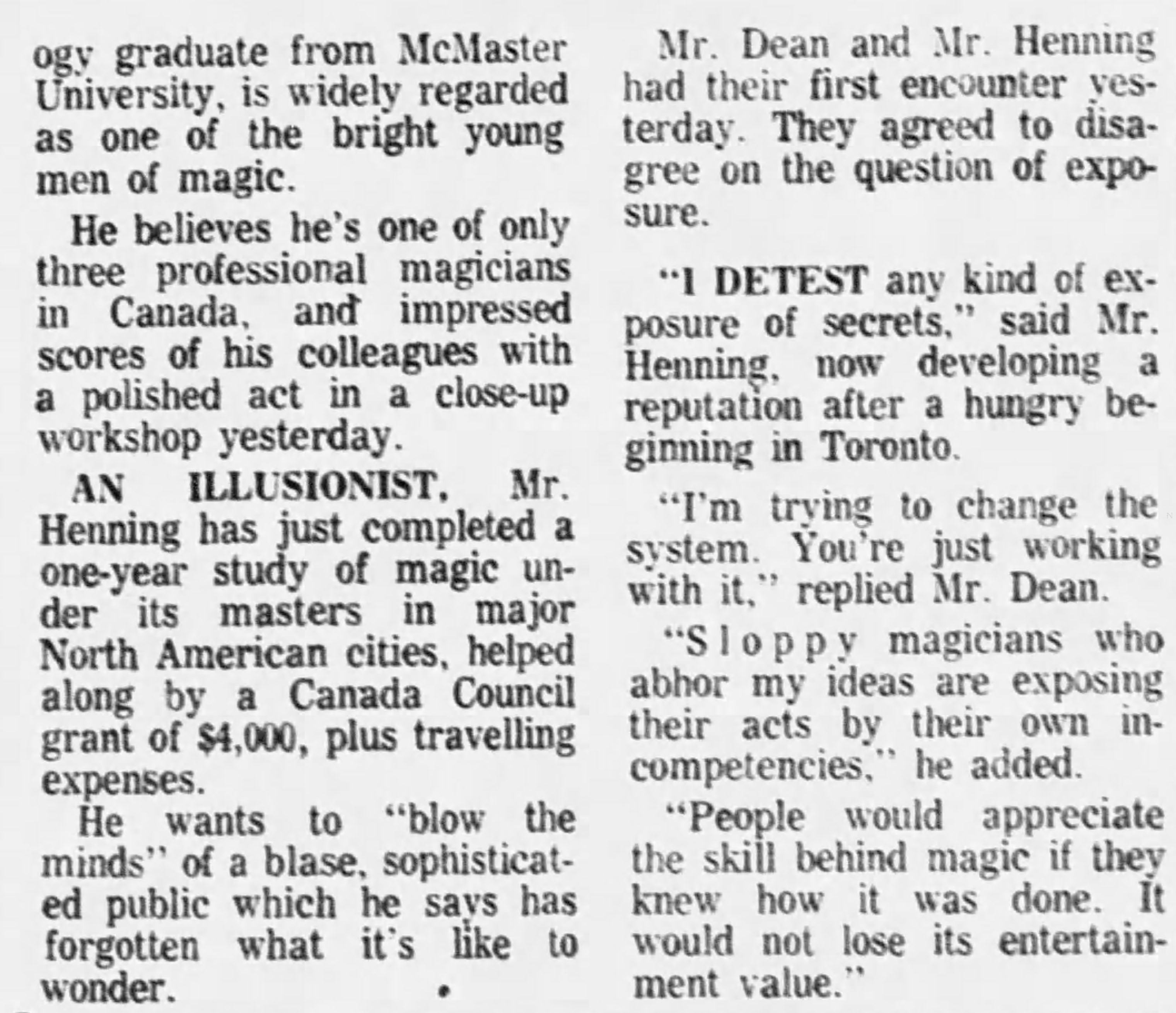 I came across this very off the beaten path and little seen article from 1972. It details a young and pre-fame Doug publicly disagreeing with another young magician, Dicky Dean, over revealing magic secrets. Naturally, Doug is for keeping the secret.