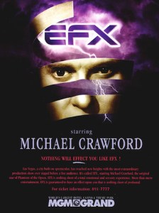 Down the Strip at the newly built MGM Grand, a show called EFX opened, and I think the goal was to outdo S&R in terms of spectacle. I think it was a direct reaction to the S&R success. It was not a magic show per se, but it had a lot of magic effects peppered throughout the show. And, it had some magical characters like Merlin, PT Barnum, Harry Houdini, and so on. The show had a lot of musical numbers built around a loose plot. And it starred musical-theatre star, Michael Crawford, who was fresh off of his starring role in Phantom of the Opera.